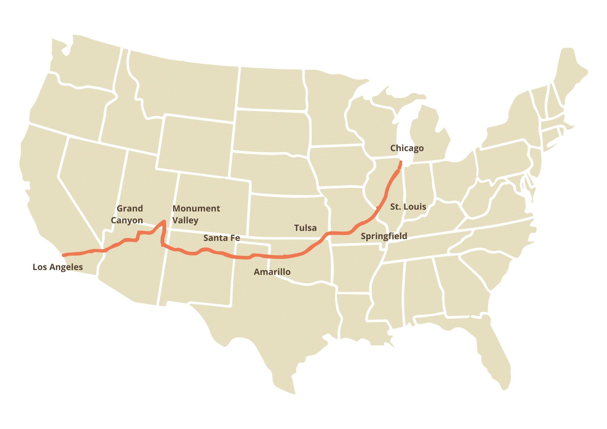 Vous roulerez à travers les plaines de Middle West, par-delà le Mississippi, le Plateau Ozark et les déserts du Nouveau-Mexique et de l’Arizona, pour arriver à l’Eldorado, la Californie !