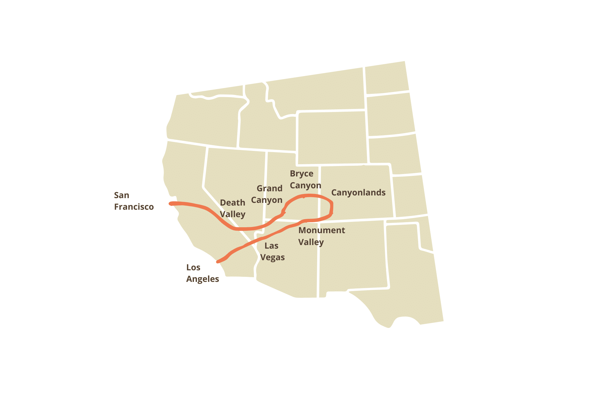 A votre arrivée, vous prendrez le volant pour un voyage de 15 jours en voiture qui vous fera passer par les lieux et parcs nationaux les plus connus des États-Unis : Grand CanyonAntelope CanyonMonument ValleyCapitol ReefBryce CanyonZion, la Vallée de la Mort et Yosemite !