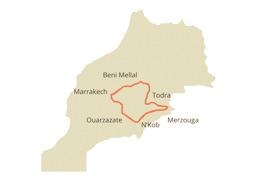 Découvrez le Maroc sous toutes ses facettes, entre montagnes imposantes et vastes étendues désertiques. De l’Atlas au Sahara, vous serez emmené(e)s à travers des paysages époustouflants, des villages traditionnels où le temps semble suspendu, et des oasis où la vie s’écoule au rythme des saisons. Vous vivrez une immersion authentique au cœur de la culture marocaine, mêlant rencontres chaleureuses, saveurs locales et moments de convivialité.